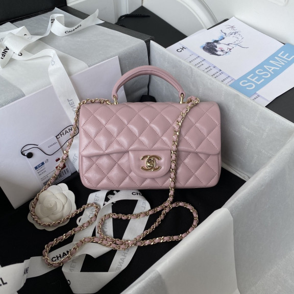 샤넬 뉴미니 탑핸들 램스킨 플랩백 금장 (핑크)